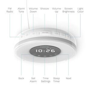 - Nature Sounds and FM Radio - Scroll through soothing nature-inspired sound options like birds, lullaby and ocean waves to wake you up. There’s also a throwback to the FM clock radio - just press radio button on clock top and touch (+) to set station