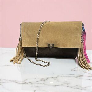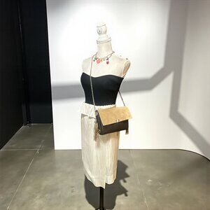 A versatile accessory for the modern professional, this convertible bag combines style and practicality. Featuring a black pebbled leather body and tan suede flap with a turn-lock closure, it offers a sophisticated touch to any ensemble. Going from day to night, carry as a clutch, shoulder or crossbody bag.