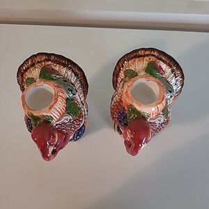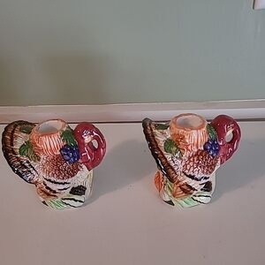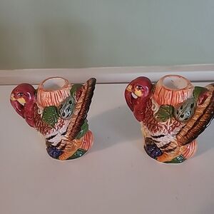 Pre-owned in good condition. Set of two earthenware turkey candleholders.They are approximately 3.5 inches tall.Comes with original box.