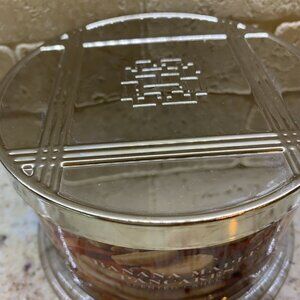 - Collectible glass vessel with decorative silver-tone metal lid embossed with Harry's monogram.