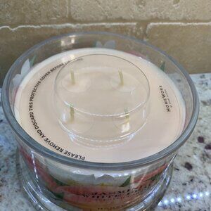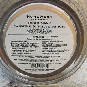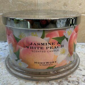 NEW - HomeWorx by Harry Slatkin Jasmine & White Peach Scented 4-Wick Candle 18 oz. Harry Slatkin has some of the best candles anywhere, and this one is no exception. Not only a beautiful container and lid, but a wonderful scent with 4 wicks and his candles deliver the most luxurious fragrance around.