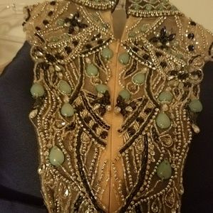 worn once and in great shape. no sign of being worn. lots of beading on chest, neck, back, and around the waist. comes with an extra shawl of fabric. size 4, but fits slightly larger.