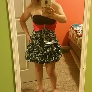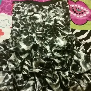 Leopard pattern on bottom half 100% polyester its closer to a size 5, only wore once