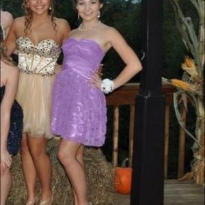 Pretty shade of purple. Looks really pretty in different lightings. Tight up top then poopy below with flowers. Perfect for homecoming or banquet attire