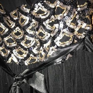 A beautiful black dress with gold and silver details! Only worn one time and looks amazing in pictures!! Size 9 and made of nylon.