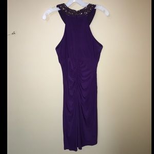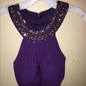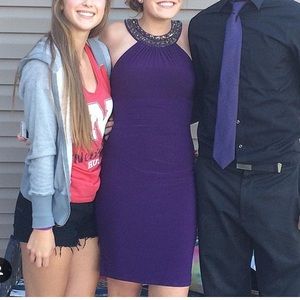 I got this dress from David's Bridal (originally $99) for last year's homecoming, wore it one time, so it is in PERFECT condition. This dress is fitted, with rouching on right front side and in the back that tastefully draws attention away from the belly area. It's an eggplant purple color with bronze beading at the collar. Has padding, but also covers up a strapless bra. It comes down to about 3 inches above the knee. This can be worn as a formal/homecoming dress or for any other fancy occasion