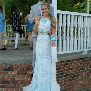 The dress is a very pretty powder blue with white lace overlay! Only worn once. Asking $350 but willing to negotiate.
