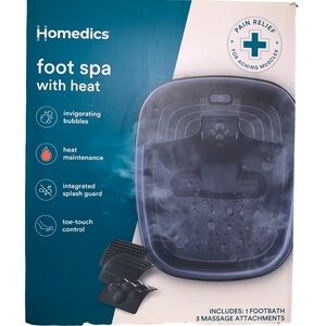 Experience ultimate relaxation with the Homedics Foot Spa. Featuring invigorating bubbles and heat maintenance, this black foot spa is perfect for soothing aching muscles. Enjoy the convenience of a toe-touch control and integrated splash guard.