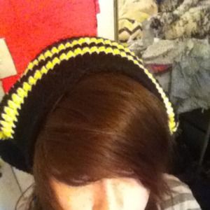 My aunt made this a while back, and I've never worn it, it's krochet and it falls back:) black and yellow I will trade