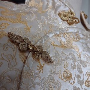 This is a beautifully homemade ivory and gold cheongsam that is longer in length. She has a side zipper closure and snaps on the side flap.