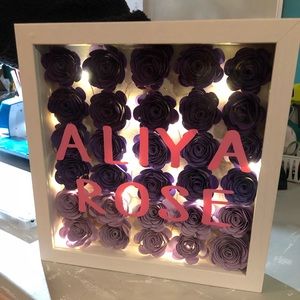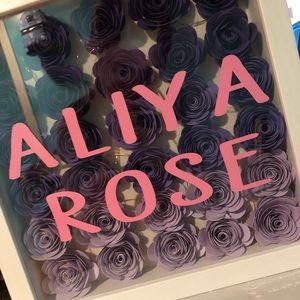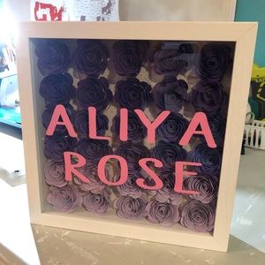 This can be customized to anything you would like. Each flower is handmade. If you are interested please comment which colors you would like the flowers and if you would like anything written on the front (Ex. Wedding, names, dates, anniversaries, quotes, etc.) and what color you would like for the font. Also comment if you would like a white or black shadow box. 9x9 frame.