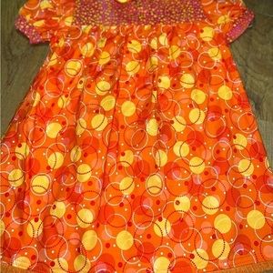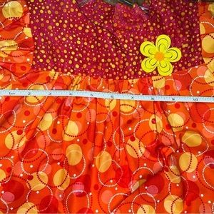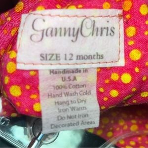 Dress is homemade by a local lady in my area. This dress is NWT. She makes the cutest clothes. I have taken measurements and posted the pics. Some of these run different in size so I recommend measuring before buying.
