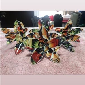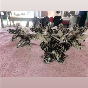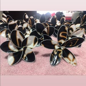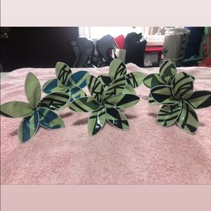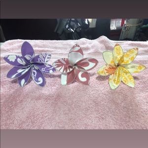 Homemade material flowers. Polynesian prints!