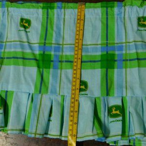 Homemade Light & Medium Blue & Green & Yellow Plaid with John Deere logo mini skirt with pleated flounce and ribbon tie at waist.
