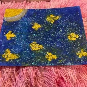 This is a homemade art thing I made I painted it blue then let it dry. Then I put a coat of glue over it, and then I put glitter on it then I let it dry again, and then I put a little sign with glue on it to put another batch of glitter, and then I made little stars