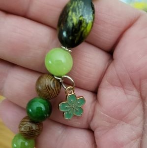 Beautiful homemade bracelet. 3 Different colored greens with brown wood looking beads. It has a beautiful green/black stone and green and gold flower charm.