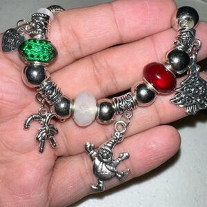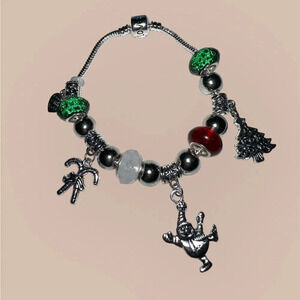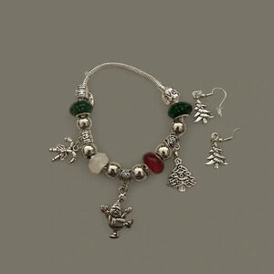 Homemade earrings and bracelet with red, green, white and silver beads and charms. Charms are Christmas Tree, Snowman and Candy canes. This is a beautiful piece to go with your holiday outfits. 🎄