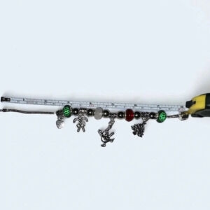 Homemade earrings and bracelet with red, green, white, silver beads and…