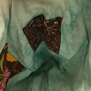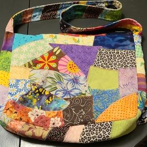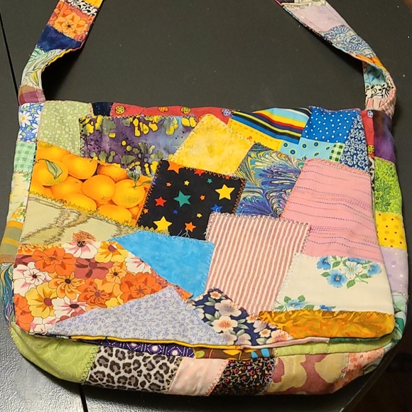 Bag is large with a long strap. Inside pockets sewn in including a side pocket for cell phone. Very spacious. No stains.