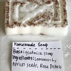 Handmade body soap made with goats milk and essential oils, Topped with apricot seed for exfoliation and with rose petals on the bottom of the bar. This bar is slightly smaller than a traditional bar of soap.
