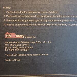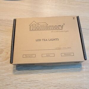 Homemory LED flickering tea lights in a compact box. Never used Perfect for creating a cozy atmosphere. these last up to 150 hours on a 3 volt battery and have a built-in timer for 6 hours on and 18 off.