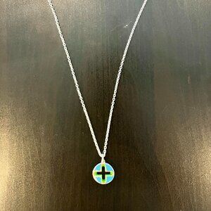 The Gradient Plus Pendant consists of a disc made from rhodium plated recycled 925 silver with a plus sign cut out from the center. The surface of the disc is hand lacquered—the curved interior slope of the cut-out is painted with lacquer in two different colors, and circumscribed by a thin line of exposed silver. Note: It is slightly faded from as seen in the photos.