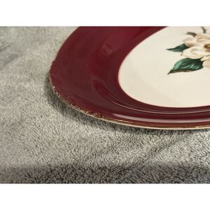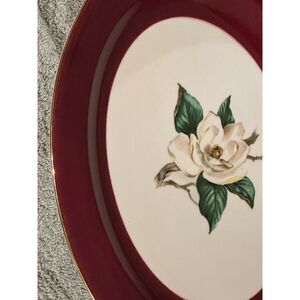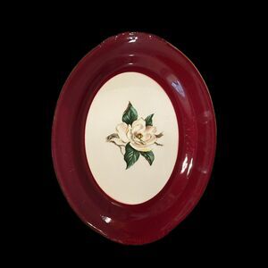 Beautiful Homer Laughlin 1954 Burgundy Magnolia DISCONTINUED pattern oval serving platter. It has scalloped ends with gold trim. Perfect for special Holiday gatherings or as a replacement piece.
