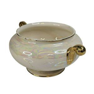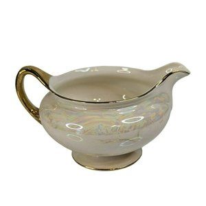 Homer Laughlin Nautilus Eggshell Creamer and Open Sugar Bowl 1940s Gold Trim Pearl Iridescent. Condition is preowned. It is from the Nautilus Eggshell line and is marked L 44 N 5. The set is free from chips or cracks and has some wear on the gold trimming shown in pictures. The creamer measures 5 3/4" across and 3 1/8" high and the open sugar bowl is 63/4" across and 2 3/4" high. Made in the USA, (PM02)