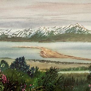 Watercolor Artwork depicting the epic and beautiful view of Homer's landscape of quintessential green foliage & vibrant fuscia fireweed looking out towards Homer Spit and the snow capped mountains and glaciers across Katchemak Bay.