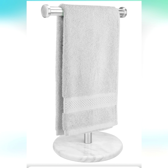 Brand New Homeries Marble Hand Towel Holder. Has a beautiful white marble base and stainless steel top. Is great for holding hand towels or jewelry on your vanity. Size dimensions in pictures!