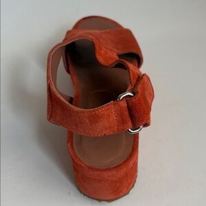 Great condition (slight imperfection left toe in photos) Homers Artisan orange suede platform sandal w velcro slingback.