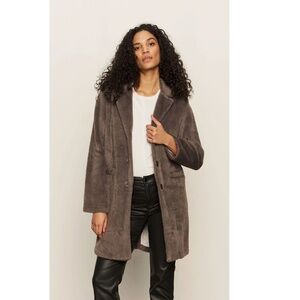 A chic longline faux fur coat in a muted taupe-grey shade. It features a notched lapel collar, button closure, and side welt pockets. The relaxed fit and soft texture give it a cozy yet polished look, perfect for layering over casual or dressy outfits.
