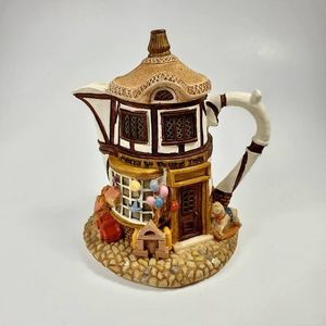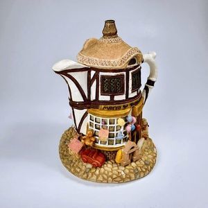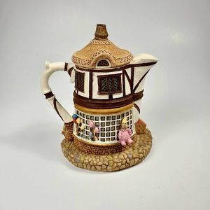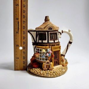Adorable rustic style resin teapot collectible figurine with removeable lid. The whimsical design features mini toys and balloons outside the Merry Go Round Toys store. The tudor style and cobblestone base gives it a vintage feel. Perfect for your fairy garden, tiered tray, or young person's room. Gift to your favorite tea lover or teapot collector. Approx 4.5" tall. In very good condition with no flaws detected.