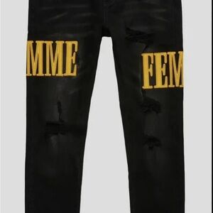 These skinny jeans combine a sleek black base with striking yellow text details, offering a modern and edgy look. The intentional distressing at the knees adds a touch of rugged style, making them a standout choice for casual outings. Their slim fit ensures a flattering silhouette, perfect for making a bold fashion statement.