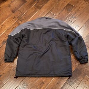 Honda F1 Racing Jacket READ USED No Size Tag, we believe that this is a Large, approximately 24” pit to pit, 30” shoulder to hem, sleeves 20” from pit to cuff. Zipper/snap front with 3 front pockets and one inner pocket. Drawstring waist, hook and loop wrists with stitched emblem. Light wear from use. Very good condition.
