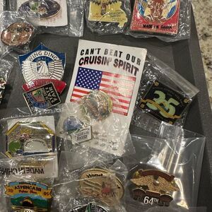 A collection GWRRA wing ding pins. Features various designs and themes. Perfect for pin enthusiasts. Estate sale pick up these have not been researched beyond inital information wing ding