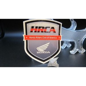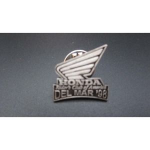 They are celebrating The Honda Riders Club's of America. The pin is unused and commemorating Del Mar, 1998. It measures approximately 1 inch long x 3/4 inch high. The pin has a silver antique look. The sticker measures approximately 3 inches wide x 3 inches high. It has never been used.