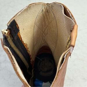 Good use condition! Genuine leather tan cowboy boots. Round toe with contrast tan stitching and filigree on top. Inner zipper closure with gold hardware. Heavy duty with treads in excellent condition. Great for workwear. Minor imperfections throughout, please see all photos.