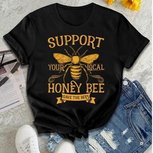 NEW! Trending Support Your Local Honey Bee Black T Shirt with Gold Lettering. Depicts a large beautiful honey bee! Perfect for all of your Spring or Summer activities! This is available in women's size Medium (6-8) Large (10-12) X-Large (14) or XX-Large (16)