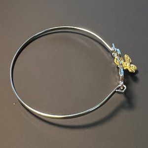 Honey bee and hive silver tone bracelet with a silver tone side hinge opening. Bracelet fits wrists up to approximately 7.75 inches. The honey bee charm is gold tone and is attached to the bee hive. New, never worn. Comes gift wrapped.