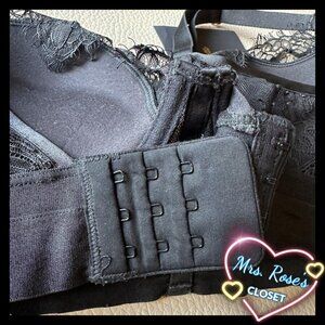 Honey Birdette Belinda Black Bra, Size US 32DD/E, UK 34dd, EU 75E, AUS 12DD. All lace detail intact without tears or flaws. Wrong size, kept in non-smoking storage as backup. Rose gold hardware and light metallic filigree style detail.