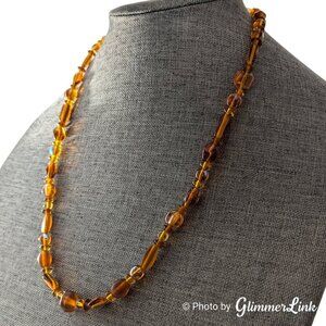 Silver tone necklace featuring various shapes, sizes and material honey brown colored beads.