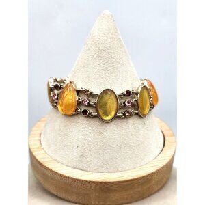 Honey Colored Cabochon Bracelet - Leaf Motif With Rhinestone Accents