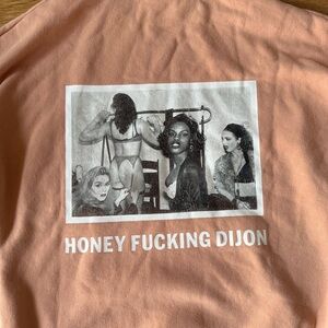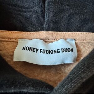 Tags: Honey Fucking Dijon hoodie, small size hoodie, colorblock sweatshirt, Tina Paul collaboration, streetwear vibe, bold graphic hoodie, urban fashion, edgy casualwear, modern street style, statement piece, cozy oversized fit, trendy layering, contemporary design, vibrant colors, youth culture fashion