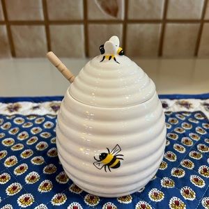Accented with a bee on the lid as well as 4 other bees randomly flying around the white ceramic honeycomb jar