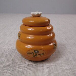 Honey Miel Ceramic Beehive Honey Pot with Lid and Wooden Bumblebee Dipper Stick.