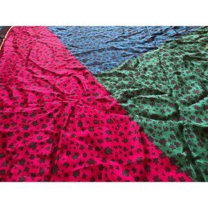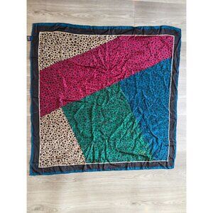 This vibrant silk scarf features a dynamic floral pattern in shades of red, green, blue, and beige. Its luxurious silk fabric provides a soft and elegant feel.