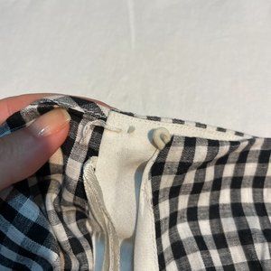 Fully lined gingham wrap mini-skirt with side tie closure, 100% cotton; Lining - 100% rayon, Hand wash. Lightly worn, like new except hook & eye closure is ripped.