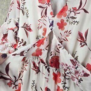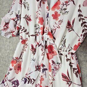 floral romper, feminine playsuit, summer outfit, Honey Punch romper, ruffled romper, women’s medium, trendy jumpsuit, V-neck romper, floral jumpsuit, lightweight playsuit, stylish romper, short sleeve romper, casual wear
