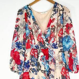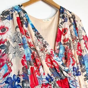 Sharing is caring, but we won't blame you for keeping the Honey Punch Jas-mine, All Mine Blush Floral Print Dress all to your adorable self. This wrap style dress in blush chiffon features a feminine floral print with shades of blue, red, pink, and grey that cascades down a surplice bodice past a gathered, elasticized waist. The sheer long sleeves add a whimsical touch for an overall look that's uniquely you.